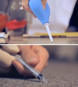7. ამის შემდეგ კი ერთჯერადი შპრიცის ან ტუმბოს საშუალებით შეგიძლიათ ისინი ასრუტოდ იატაკიდან და ჩაუშვათ მომზადებულ წყლიან ქილაში. არავითარ შემთხვევაში არ გამოიყენოთ მტვერსასრუტი და ცოცხი.